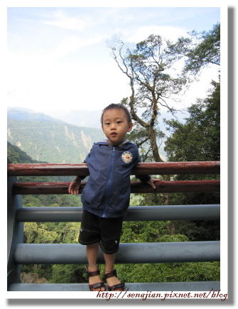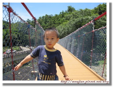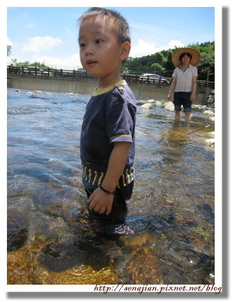 過吊橋接著就要到溪邊了,軒突然要拉屎,帶他去樹林裡面蹲著拉,順便施肥....大完去溪邊順便洗屁股....哈!溪水非常涼快,但水流稍微有點湍急,沒有稍加注意就會被水沖到小瀑布下面去,光著腳丫子踩著石頭走還滿痛的,還好我有帶布希鞋來,軒穿著托鞋就只能光著腳下水,涼涼的水泡起來很爽,軒也非常高興,踩著石頭一臉愉悅,如果我有帶自己的換洗衣物,一定要到溪水中央去撿石頭,但只有跟老公出去才有可能這樣,老爸老媽出門大包小包,帶了一堆東西,限制這個限制那個,還會催著要走,玩起來一點都不盡興....