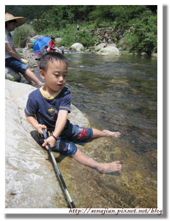軒腳泡著水,老媽就擔心他感冒會再度著涼,才讓軒踩了一會兒溪水就被叫去溪邊的石頭坐著看溪水....真是可惜呀....軒坐在石頭上也不得閒,老爸帶了抓魚網讓軒去撈水,沒得玩水,撈撈魚也高興,在這裡停留不到半小時,老爸就急著要去別的地方,軒也是個知足的孩子,玩到了就高興,再度提著一堆東西回車上....