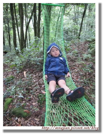 就這樣睡了1個多小時,老爸把旅行用小桌椅拿出來,老媽把帶來的水果拿出來吃,醒來出了車門,哇!這真的是天然的超強冷氣,涼到會發抖哩!我們全部都穿上了外套,不然還真的會著涼呀!軒拿了一片蘋果,跑到吊床上找外公,祖孫倆一起吃蘋果,吃完後老爸讓軒自己躺在吊床上,搖來搖去像盪鞦韆一樣,軒還挺悠哉的喔!老媽看軒自己坐在吊床上,一直覺得不妥,就躺上去讓軒坐在身上,躺在吊床上看起來很舒服呢!