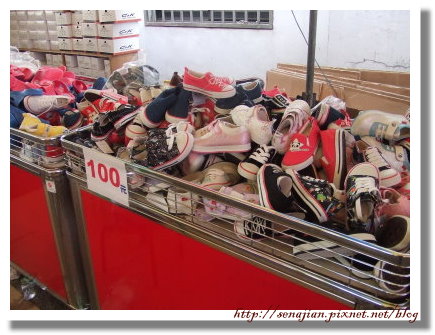 後來到鞋廠的另一邊逛,沒想到有范倫鐵諾的樣品童鞋出清,當然也有女鞋和男鞋,現在貨挺齊的,大部分是13號或17號居多,花車上所有的鞋款出清價100元,幫軒挑了1雙帆布鞋,晚上跟老公說有鞋子的特賣,老公也想去挑雙拖鞋呢!