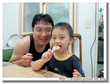軒拿著雞腿吃得好開心,趁他高興,拍了幾張跟拔拔的合照,軒雞腿吃一半就說要分給雪兒了,哈哈!老公啃掉皮,給軒再啃一些肉,就讓雪兒吃吃稍微帶有肉渣的雞腿囉!一家三口吃得飽飽的,真是開心,吃完的時間是晚上九點鐘,趕緊準備打點讓軒休息囉!