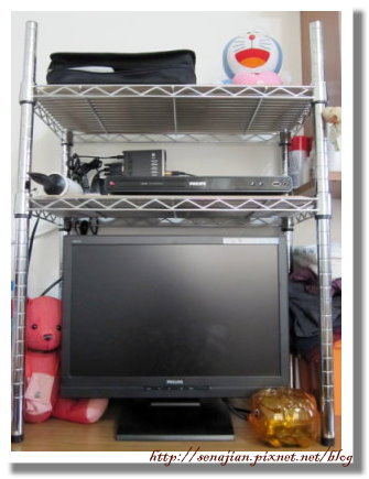 今天下午跟老公一起帶著軒去特力屋尋找合適的櫃子放螢幕,找了一組三層櫃,可惜寬度不夠長,後來看到加寬的三層櫃,寬度又太長,後來逛到鐵架區,就找到尺寸比較剛好的鐵架,這種架子可以自己DIY組裝成喜歡的樣式,各種大小都有,還有其他週邊的小架子可以安裝,先買一片鐵架與四支鐵管,要是有需要增加架子再來買就好。