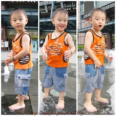 今天天氣陰陰的還不錯,沒有出大太陽,玩起來也比較盡興,軒脫掉鞋子開始玩水,剛開始還不太敢玩,我還拉著他去摸水柱,牽著他的手穿過水柱行走,還把他放在水柱上沖屁股,熱身5分鐘之後,軒就非常High的玩水了。