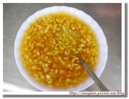 我是吃純的綠豆蒜,溫熱的綠豆蒜裡面還加了Q圓,讓綠豆蒜的口感不至於太單調,湯頭微甜,吃起來不會黏膩,仔細看看,還真的很像一整片蒜在湯裡。