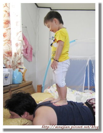 老公之前叫我按摩,我懶得幫他抓龍,派出軒去踩老公的背,讓兒子給拔拔馬殺雞一下,剛開始還要牽著軒的小手踩背,到後來軒踩出心得,連大小腿都會踩,平衡感還算不錯。
