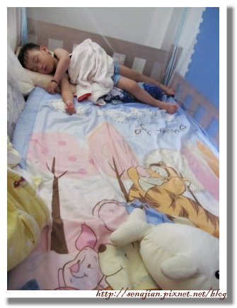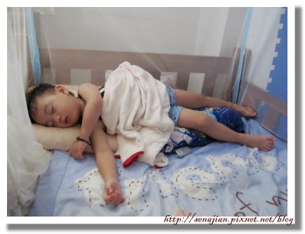 當我開始考慮要買好一點的防水墊時,軒慢慢的開始會睡到床上去,雖然還是喜歡整個人橫躺在枕頭上,不過次數也慢慢減少,可能軒也感覺到床變軟了吧!呵!軒的床可比我們夫妻倆大床還好睡呢!