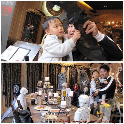 買好了棉套,一家三口跟老妹到誠品去逛逛,沒想到剛好有活動,到處有吃、有喝、有玩,接近萬聖節,有店家還擺設特殊的場景,軒剛進去超怕的,經過拍了數張照片,軒也跟拔拔玩起來了。