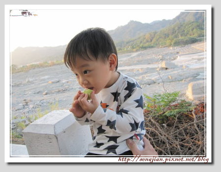 離開東勢老家,我們到石岡水壩走走,這裡沒什麼好玩,看看夕陽與水壩,帶軒散散步、走一走,老媽帶水果讓大家享用,芭樂很甜,軒吃得很高興呢!本來是由老公拿著餵他吃,到後來軒討得很兇,乾脆讓他自己拿著吃。