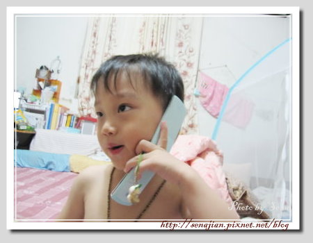 平常軒聽到我們的電話聲,他就會吵著要講電話,在吵的當下,請他先等大人講完,再由大人決定是否要讓他接電話,軒一拿到電話就滔滔不絕的說起來,連我講電話的語助詞,他都學得維妙維肖。