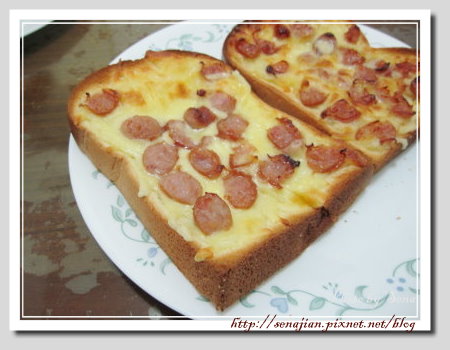 鬆軟的土司上鋪上香濃的乳酪,再搭配美味的德國香腸,烤過後整個土司外酥內軟,綿密的口感,香醇的味道更濃郁,吃起來美味又可口,金黃的色澤,更能刺激味覺,令人食指大動。