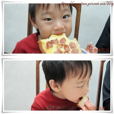 軒不論是吃純土司,或是特製的土司披薩,都很興致勃勃,脆脆的土司邊是軒的最愛,看他一口接著一口的猛吃,我也不由得拋下相機一起來品嘗這好吃的早餐。
