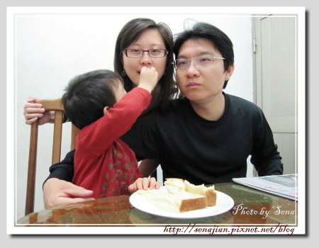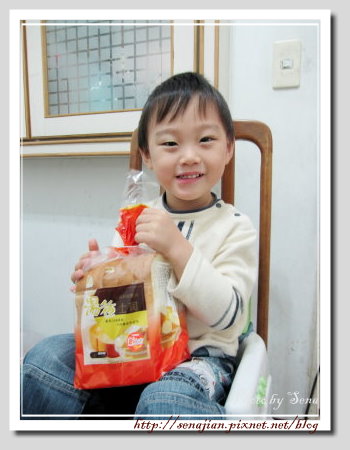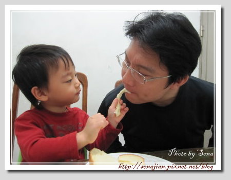 披薩土司吃完了,軒還是繼續吃著奶油風味土司,軒自己吃得開心,也會分給拔拔和媽媽吃,一點兒都不小氣,妳一口我一口,你儂我儂,愛,盡在不言中!