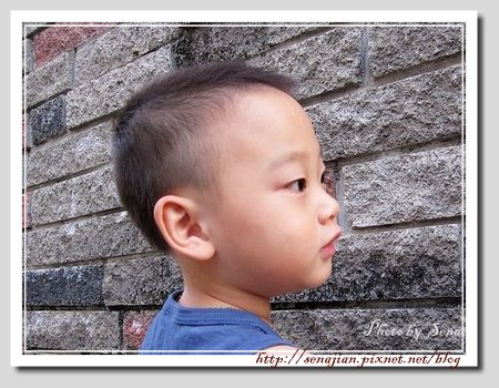 剪完後打電話跟老公講:「我們家軒軒被我剪得像小瓜呆了。」老公緊張得連上班時都還繞回來看一下軒,果然被我嚇了一跳,看到軒的新髮型後,還說剪得不錯只是邊邊需要補強修一下。