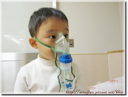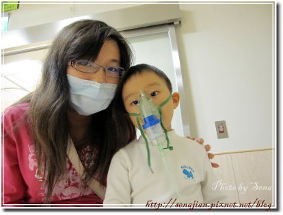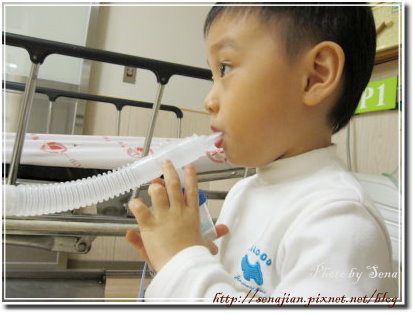 軒吃飽後,老公還在工作,老妹就陪我跟軒一起去中國醫藥學院掛急診,到了急診後,老公也到醫院了,醫生讓軒吸藥減緩氣喘的症狀,但軒邊吸邊玩,沒辦法把藥深吸到肺部,因此第一次吸藥效果不彰。