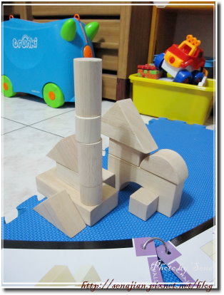 今天陪著軒看圖堆積木,完成了3組,之後就讓軒自由發揮,沒想到軒可以自由堆疊出城堡的型狀呢!