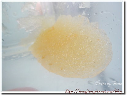 膨脹的凝膠,帶有一點顆粒狀,吃起來像蒟蒻的口感。