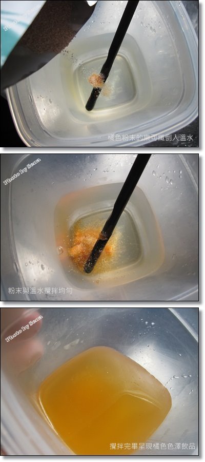 5.沖泡容易,250ml溫開水的溫開水加入1包樂可纖,攪拌均勻後就可以喝到柑橘口味的飲品。