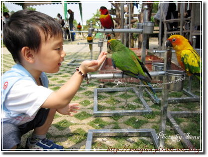 一進牧場就看到一群鸚鵡,我們家有養鸚鵡,因此軒對鳥類並不陌生,只是沒有餵過鸚鵡,看他興奮的拿著瓜子餵鸚鵡,非常開心。