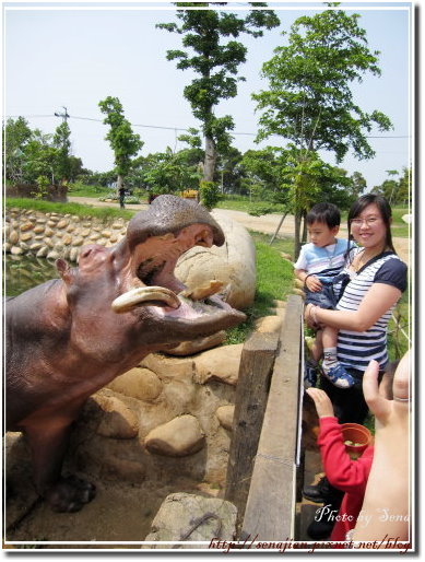 趁著沒甚麼人了,我們再去餵一下阿河,軒這下子接近河馬的嘴巴,已經不會害怕了,丟飼料也能丟進阿河的嘴巴裡面了,把飼料餵完後,拿著飼料桶去找牧場主人領賞囉!