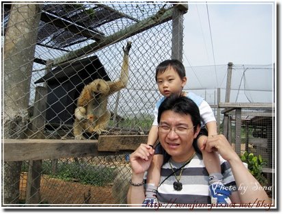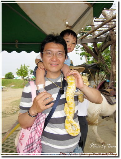 今天算是半個假日,牧場內的遊客並不多,所以牧場主人都讓我們這群剩下來的遊客能接觸園區內的動物們,還邀遊客去騎水牛、看白化刺蝟,甚至連大蟒蛇都讓遊客抱一下,我當然是不敢,所以這回讓老公抱著軒體驗囉!