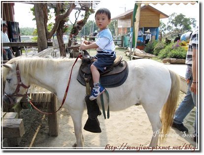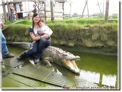 只是遠遠的拍個照而已,沒想到鱷魚竟然也可以騎,我們排隊去坐鱷魚,牧場的主人說,坐在鱷魚身上,因為牠感受到壓力,所以嘴巴會張得很開,最重要的是人不要超過牠的前腳,否則會兇性大發....輪到我坐上去時,軒還很怕,整個人貼在我身上,其實我也很怕哩!而且坐沒多久,這隻鱷魚竟然動了,牧場主人叫我們趕快起來,呼....太刺激了啦....應該讓老公去坐的....