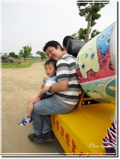 最後讓老公帶軒去坐糖果水泥車,環繞牧場一圈,坐完還可以領糖果,軒拿到糖果後就準備離開牧場囉!