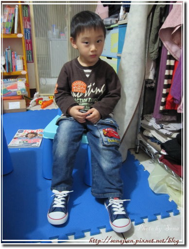 去年的特賣會買的鞋子,都是預先買來等軒長大穿的,其中一雙就是帆布鞋,軒的腳一天天長大,這幾天發現有兩雙鞋子又要準備下架了,整理客廳時,看到特賣會的帆布鞋,剛好是軒可以替換的尺寸。