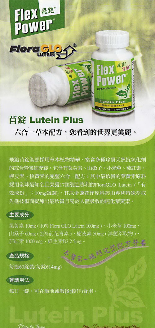 飛跑苜錠全部採用100%草本植物精華,富含多種珍貴營養素的綜合營養補充錠,包含有葉黃素、山桑子、小米草、茄紅素、檞皮素、核黃素的完整六合一配方,六大防護營養素,一瓶抵六瓶;其中最珍貴的葉黃素原料採用全球最知名且榮獲17國製造專利的FloraGLOLutein(有效成份:10mg每錠,使用10%FloraGLO Lutein 100毫克),其以金盞花作原料經由專利特殊萃取先進技術而提煉出最珍貴且易於吸收的純化葉黃素。