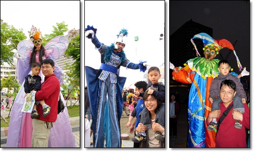 活動會場內不定時有踩高蹺的人偶跑出來亮相,每個人紛紛上前握手與拍照,有漂亮的蝴蝶仙子、帥氣的王子以及逗趣的小丑。