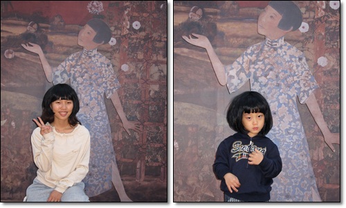 另一頭是兩個女子的畫像,軒跟老妹都戴上假髮拍照,老妹看起來像小村姑,軒看起來像鄰家小妹,真是可愛呀!