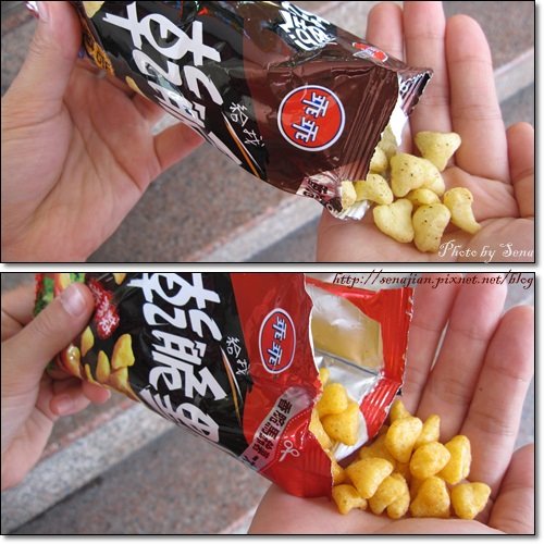 另一種口味是岩燒牛,胡椒味非常重,也是微辣的口感,軒吃到這種馬鈴薯小點,開心的合不攏嘴,瘋狂猛吃,自己還會拿來直接往嘴裡倒,吃得不亦樂乎。