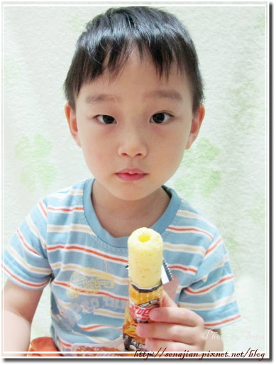 看到了玉米濃湯口味的玉米棒,開來讓軒品嘗,玉米濃湯的味道很香,口味不會很重,軒瞪著餅乾口水直流,還得忍住想吃的衝動讓我拍照,真的是很可愛又敬業的小寶貝。