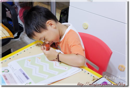 之前幫軒買了一套左右腦開發系列操作書,裡頭的程度稍微有點難度,軒畫不好一直失去信心,好一陣子不願意拿筆畫畫,這次買的操作書,讓軒重拾運筆的信心,拿到書先用手指畫,還開心的問我:「這樣對不對?」