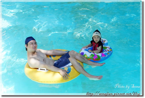 後來玩膩了,拿出小泳船來滑水,吸引了旁邊的小姊姊,她跑來問我可不可以一起玩,我請她直接去問軒,軒看到有玩伴來了,開心得不得了呢!