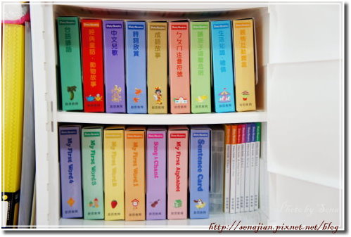 跟ERIC媽媽訂了4組掀門置物箱,上層放中文圖卡,下層放多媒體語文教學組,除了寶寶熊之外,啟思所有的教材通通都可以放得進去,不多不少剛剛好喔!