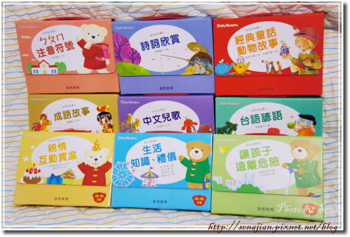 啟思寶寶熊的圖卡,中文的部分有標準注音符號教學、生活知識與禮儀教育、讓孩子遠離危險、爸媽及親人的關懷、台語諺語、成語故事、詩詞欣賞、經典童話與動物故事、中文兒歌、ㄅㄆㄇ注音符號。