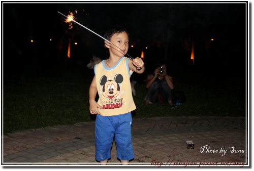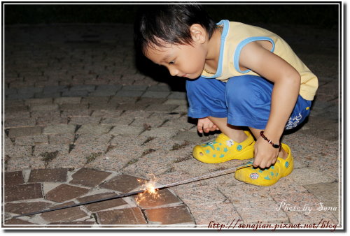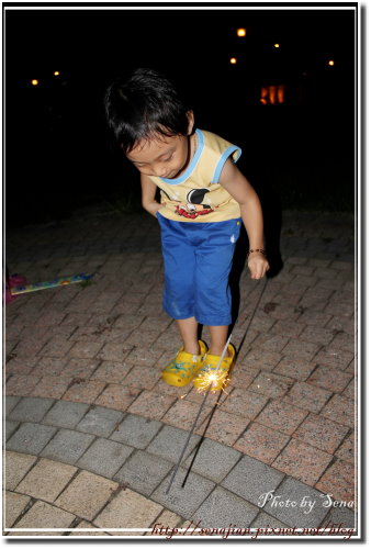玩過後,軒HIGH到把仙女棒亂丟,在我的督促之下,撿起來放到指定的位置時,軒沒拿好,拿到了仙女棒剛燃燒完的位置,痛得哇哇大哭。