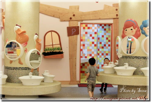 地下一樓的廁所很可愛,洗手台還有分大人與小孩,這是為家庭所設計的親子廁所喔!。