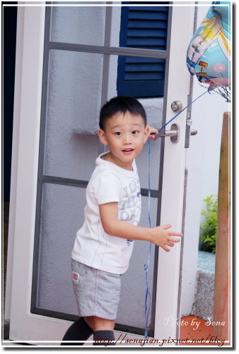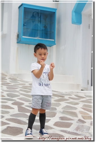 我跑回聖托里尼山城找,原來軒跑到聖托里尼山城的餐廳門口綁氣球,差點以為他走失了哩!