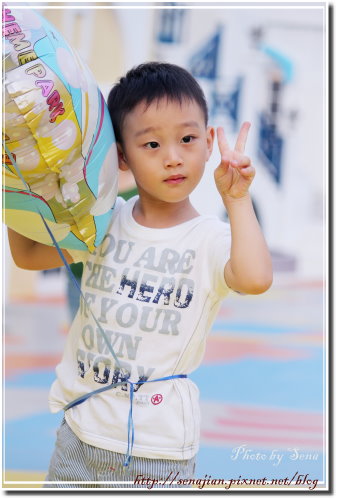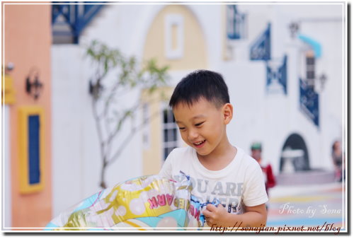 軒拿著汽球,在一旁自己玩,我拉他到聖托里尼山城拍照。