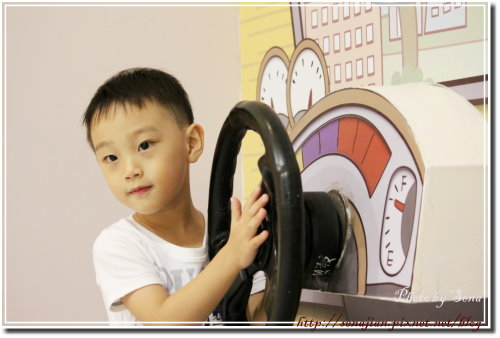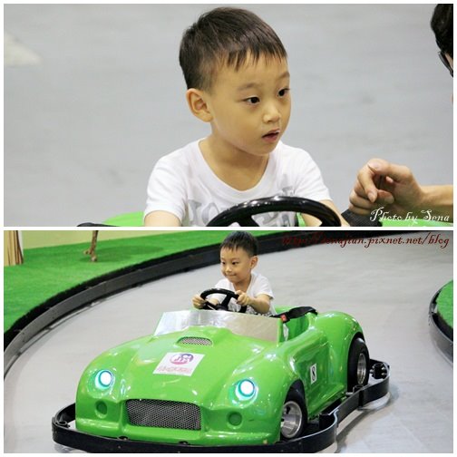 在歡樂城堡旁是小小駕訓班,軒平常有去夜市開車,技術還不錯,我跟老公問軒要不要去開車,剛開始還會顧慮要陪喬玩,後來喬有時候會躲起來讓軒找不到,軒決定答應跟我們去排小小駕訓班。