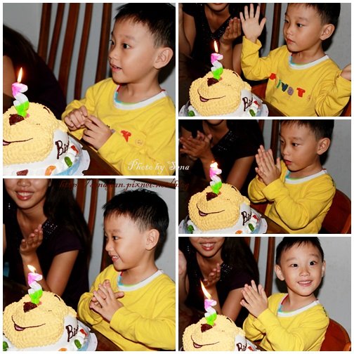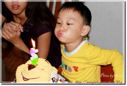 全家人聚集在一起,為軒唱生日快樂歌,軒滿4歲,老媽說中國人要算虛歲,所以蠟燭選擇了5的數字。