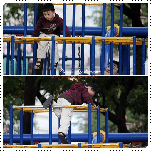 另一頭是兒童公園,軒完全不怕高,直接爬上立體方格攀爬架。