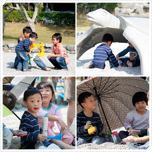 覺得熱了,就躲到烏龜石頭下面,跟別的小朋友堆砂,甚至還知道要找有傘可遮蔽的小朋友群玩耍。