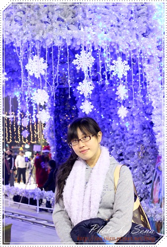聖誕樹山洞上頭有雪花的擺飾,沒發光時就像雪花般透白,發光時就像是天上落下的星星喔!