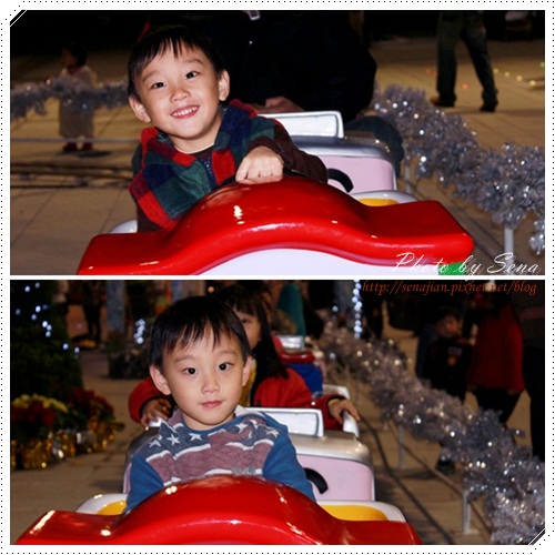 軒如願的坐到小火車,興奮的露出笑容,整路都開開心心的握著方向盤,搖搖晃晃的坐一圈聖誕火車。