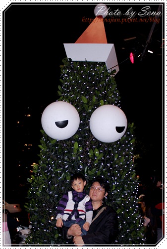 晚上的俏皮聖誕樹,亮起燈來,更可愛了,兩顆眼睛整個很搞笑。