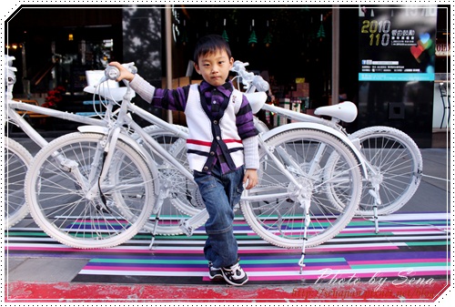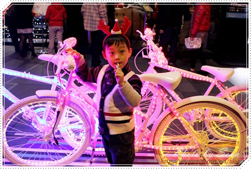 誠品綠園道旁,四處已經有著濃濃的聖誕味了,各式各樣的燈飾在白天完全看不出來,軒看到金色三麥前擺著腳踏車,還以為可以騎,一度還想爬上去試試看....