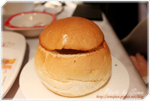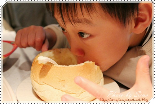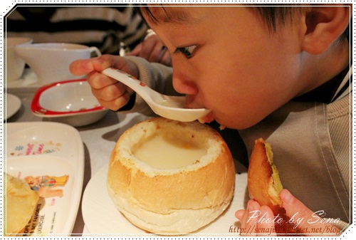 王品招待小朋友一份濃湯,幫軒選了法式麵包玉米濃湯,把麵包當成湯碗,真是別出心裁的設計。