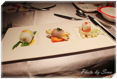 沙拉類,我選擇松露鮮蔬佐鴨胸海鮮,煙燻鴨胸捲著蘋果條搭配新鮮木瓜,以及鮮干貝搭配竹筍,再加上小捲與新鮮蘆筍的搭配,清爽的口感非常開胃。